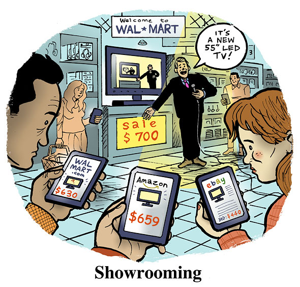 Algunos de los principales minoristas, como Target, están tratando de batalla showrooming mediante la venta de productos exclusivos para sus tiendas. Cadenas comerciales como Walmart está permitiendo a los clientes recoger los artículos en las tiendas para evitar los gastos de envío de las compras en línea; expandiéndose esta practica a los países europeos.