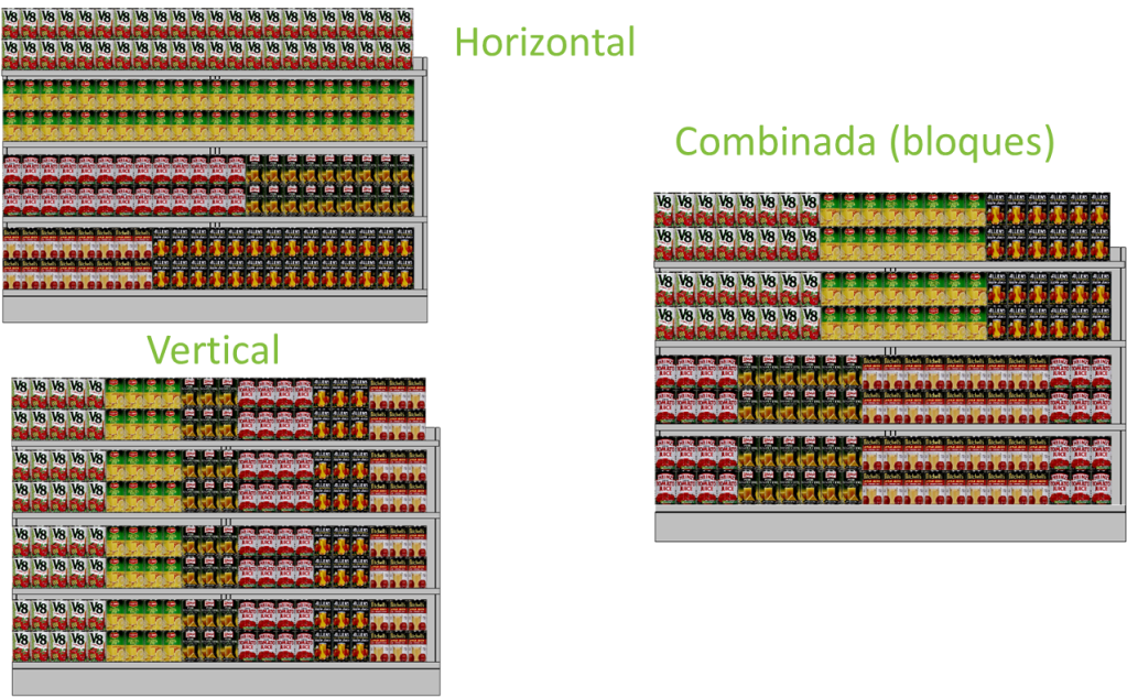 En tiendas de menores dimensiones se pueden usar exhibiciones horizontales, más aún cuando son categorías atomizadas como por ejemplo, Galletas, sin embargo, para cada tipo de ordenamiento existen técnicas, para lograr el mejor desempeño según el objetivo que estemos buscando para esas categorías, las cuales pueden ser generadoras de tráfico, rentabilidad o simplemente ventas en volumen para generar flujo de caja.