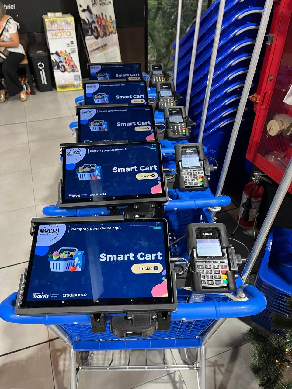 Los carritos inteligentes tienen incorporada una tablet, un software impulsado por inteligencia artificial y un datáfono de Credibanco, que le permite al cliente escanear con la tableta cada producto que deposita en el carro para llevar, hacer la lista con el valor de cada compra y al final solo debe seleccionar en el datáfono la opción de pago (débito o crédito) acercar la tarjeta y cancelar, con lo cual finaliza la compra.