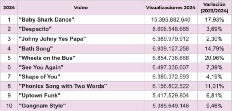 El Top 10 está encabezado por Baby Shark Dance la versión en inglés de la popular canción infantil que nació en Corea del Sur. En el segundo lugar se sitúa la creación de Luis Fonsi, Despacito, que acumula más de 8.608 millones de visualizaciones. El podio de los videos más vistos de YouTube lo completa otra pieza musical infantil, Johny Johny, Yes Papa, una canción de cuna en inglés que hasta el momento ha logrado acumular más de 6.989 millones de visitas. Este video se subió a la plataforma en octubre de 2016.