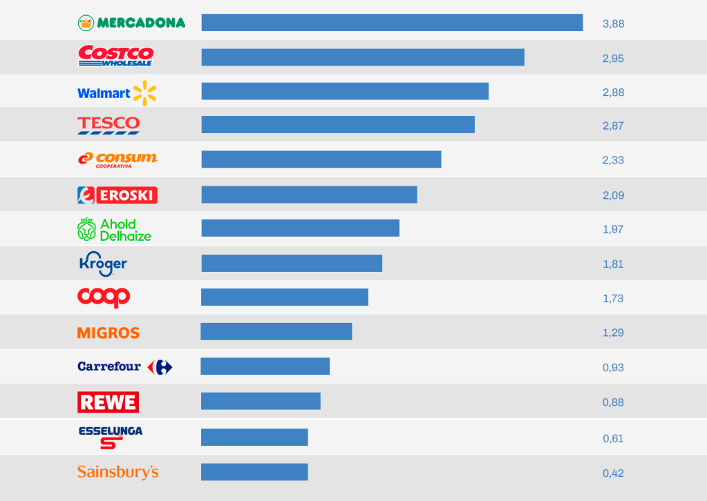 El gigante español del retail, Mercadona es el comercio de minoristas más rentable del planeta, gana 3,88 euros por cada 100 euros que vende, una cifra que bate a líderes mundiales del sector como Walmart, Tesco, Costco o Carrefour.