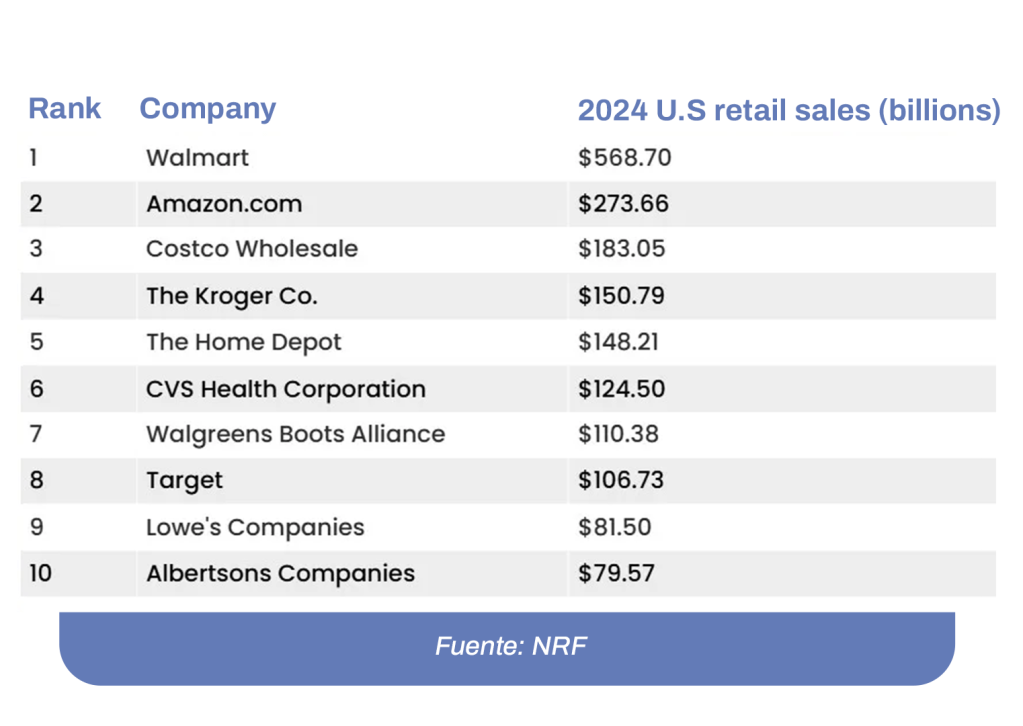 Amazon.com volvió a ocupar el segundo puesto, con 273.660 millones de dólares en ventas minoristas en Estados Unidos, lo que representa un crecimiento del 9%. El minorista aumentó sus tiendas en Estados Unidos en un 2,8%, ahora en 584.