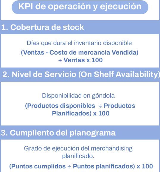 En el items de operación y ejecución, el experto Oyuela recomienda poner foco en la cobertura del stock, la disponibilidad en góndola y el cumplimiento del planograma. En relación con el stock, el manejo de los inventarios compromete claramente la gestión operativa de los negocios. Alberto Delgado, presidente ejecutivo de GS1 para Venezuela, asegura que en un 13% de los casos, «los productos no está en los anaqueles porque, simplemente, se quedó en la trastienda. Vale decir, se hizo todo bien en la cada de suministro, pero se nos olvidó llevarlo al piso de venta».