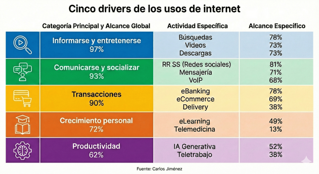 De acuerdo con el estudio, como era de esperarse, el consumo de contenidos y la conexión social son la puerta de entrada a internet. El driver de «Informarse y entretenerse» alcanza una penetración casi total del 97% , sostenido principalmente por las búsquedas (78%) y el consumo de video (73%). Muy de cerca, con un 93% de alcance global, se ubica la necesidad de «comunicarse y socializar», donde las redes sociales (81%) siguen superando a la mensajería directa (71%) como actividad primordial.