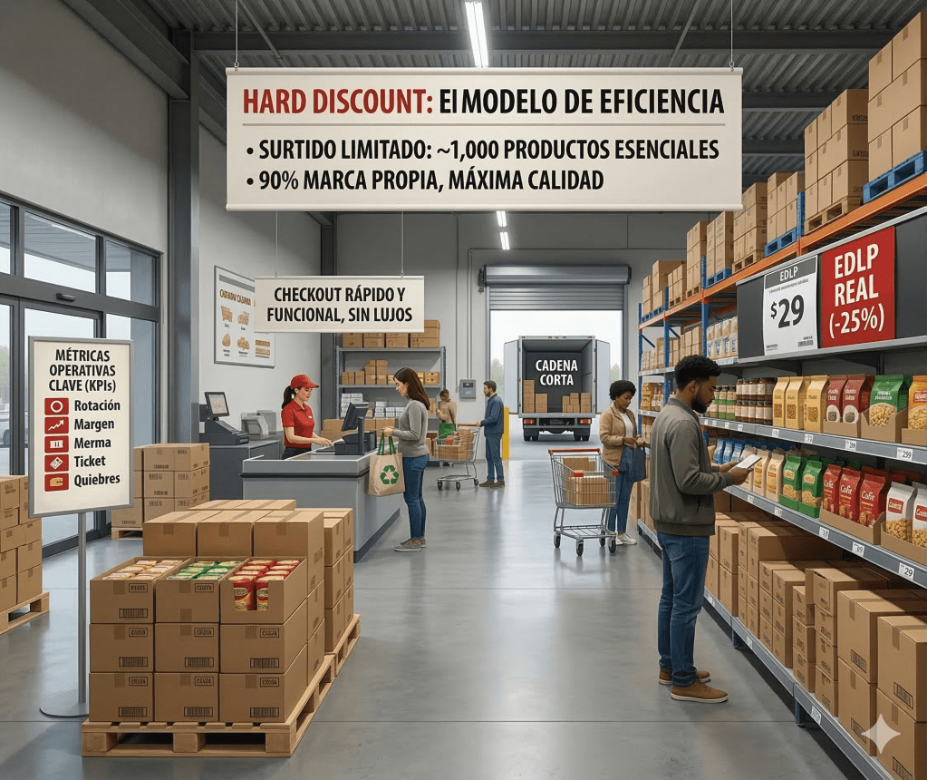 Toda esta simplificación operativa tiene un propósito gerencial claro: permitir que la toma de decisiones se concentre de manera absoluta en menos de cinco indicadores de desempeño críticos. Al prescindir del ruido estadístico que abruma al retail clásico, la gestión del Hard Discount vive o muere por el control de las siguientes métricas: